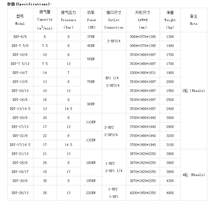 DDY 系列電動移動螺桿式空氣壓縮機技術參數